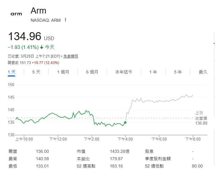 截稿前,安謀 (ARM-US) 盤前股價上漲 12.43%,每股暫報 151.73 美元。