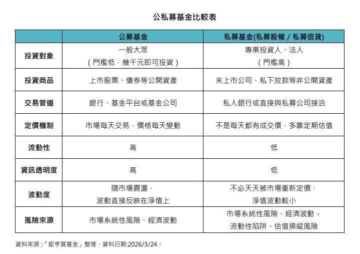 要理解現在市場在擔心什麼,得先知道私募基金和一般公募基金的差別。公募基金是一般人就能申購的商品,投資門檻低,平常透過銀行、基金平台或基金公司都能買到。它投資的多半是上市股票、債券這類公開市場資產,所以價格幾乎每天都會隨市場變動,流動性高,資訊揭露相對完整。相較之下,私募基金主要提供給專業投資人和法人,投資門檻高,投資標的多是未上市公司,或其他不在公開市場交易的資產,常見類型包括私募股權與私募信貸。這類商品通常不是一般人直接在平台上就能買到,而是要透過私人銀行,或直接和私募機構往來。