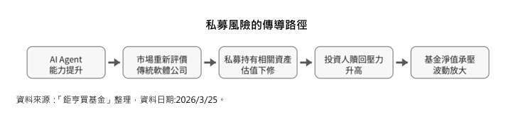 私募市場長期以來一直存在兩大核心問題,分別是流動性較低與估值透明度較弱。這些風險之所以過去沒有明顯浮現,很大程度是因為主要買家多是校務基金、退休基金或保險等長線資金,本來就不急著贖回、願意接受長時間的資金鎖定,讓私募基金的淨值表現看起來相對平穩。不過,隨著市場開始擔心 AI Agent 的能力開始被市場重新評估,傳統軟體公司的商業模式、估值與成長,可能都會被重新檢驗。偏偏私募股權與私募信貸對這類傳統軟體公司曝險不低,一旦市場認為這些公司的未來現金流與獲利能力不如過往想像,私募基金手上的資產價值就可能被下修,進而引發贖回壓力,造成淨值大幅下滑。