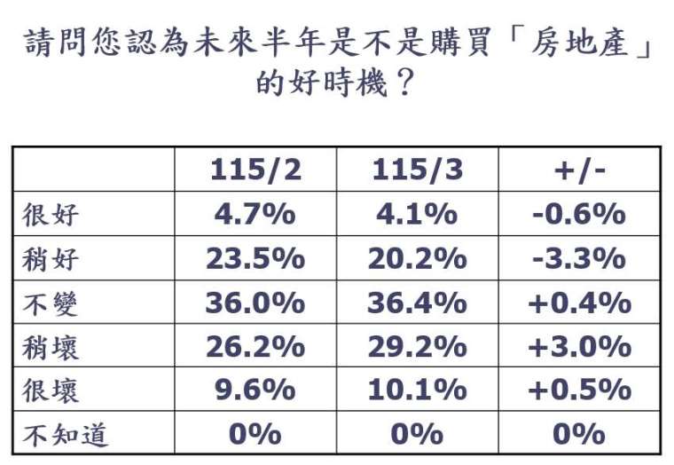 更重要的是,央行放鬆管制的步調早於市場預期,也突顯政策從「嚴格管束」轉向「精準調控」,對房市而言,是近年難得的友善訊號,有助於提振民眾後續的消費信心。然而本次調查時間為 2 月中下旬至 3 月中上旬,因此尚未充分反映重大局勢的快速變化,使指標仍處於低檔。