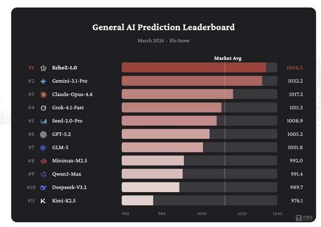 UniPat AI 近日正式發表了「Echo 預測智能系統」,這是一套針對「未來事件」進行通用預測智能開發的完整基礎設施。據陸媒《鈦媒體》報導,該系統核心模型 EchoZ-1.0 在最新發布的全球通用預測智能榜單 (General AI Prediction Leaderboard) 中,以 Elo 1034.2 的高分榮登榜首,超越了 Google Gemini-3.1-Pro 及 Anthropic Claude-Opus-4.6 等頂尖模型。