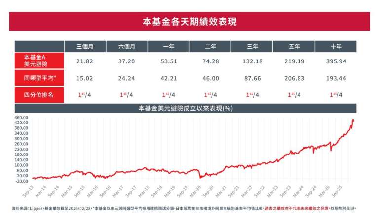 日股強勢表現,也同步帶動相關基金績效走揚。以瀚亞投資 - 日本動力股票基金為例,近一年報酬率接近 40%,明顯優於日股大盤;近三年、近五年累計報酬率亦分別超過 118%、218%,無論短、中、長期表現均領先同類型基金平均。