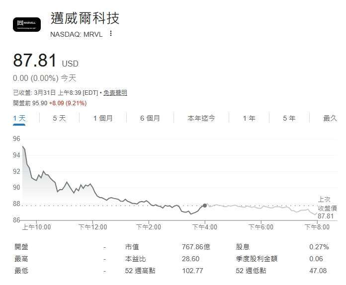 截稿前,邁威爾 (MRVL-US) 周二盤前股價上漲 9.21%,每股暫報 95.90 美元;輝達 (NVDA-US) 盤前股價上漲 1.41%,每股暫報 167.50 美元。
