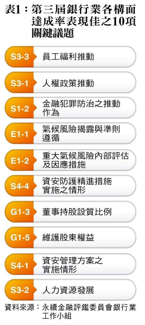 評鑑構面項下還設計「關鍵議題」。觀察本屆銀行業平均達成率較高、平均表現最佳的六大關鍵議題包括:員工福利、人權政策、金融犯罪防治、氣候風險揭露及準則遵循、氣候風險因應、資安防護,可以說是本屆的亮點所在。