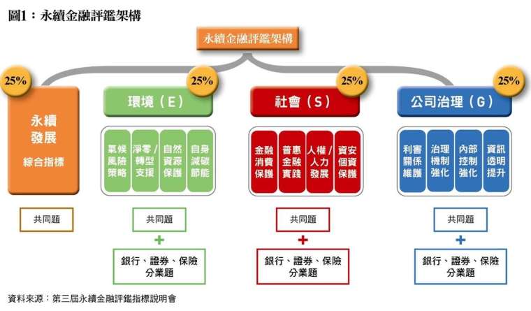 第三屆評鑑指標內容也是幫助金融業精準呈現永續推動的亮點。評鑑指標內容含括六大重點:「資訊揭露的完整性」、「永續風險管理能力」、「引導客戶明確訂定轉型相關計畫」、「人才培訓及專業訓練」、「普惠金融的落實」以及「強化董事會功能」,是爭取對齊重點獲得評鑑績效的關鍵。