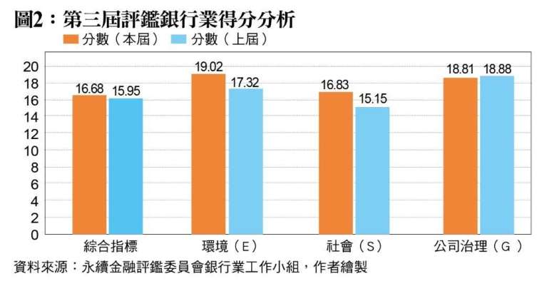 銀行業的資產規模在金融機構中最為龐大,身負引導永續投融資資金挹注的重任,其在永續金融的表現也成為各方關注的焦點。觀察第三屆永續金融評鑑銀行業總平均得分為 71.35 分,高於上屆的 67.30 分,其中永續發展的綜合指標平均得分為 16.68 分、E(環境)支柱平均得分為 19.02 分、S(社會)支柱平均得分為 16.83 分、G(公司治理)平均得分為 18.81 分,除了 G 支柱約略與上屆持平之外,其他均優於上屆表現。