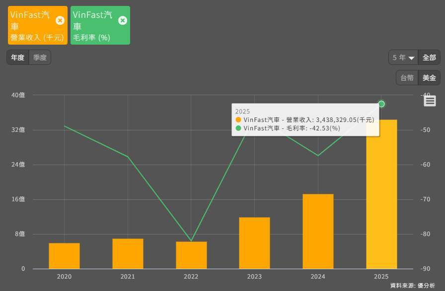 從財務表現來看,VinFast 在 2025會計年度淨損約40億美元,雖然公司過去曾提出 2025年達成毛利率轉正的目標,但市場分析師普遍認為,以目前的營運節奏來看,較合理的時間點可能已延後至2027年至2028年。