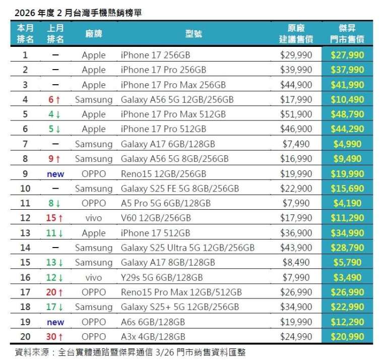 相較於蘋果的退守,本月三星以七席入榜數超越蘋果,成為入榜席次最多的品牌。除了 Galaxy A56(12GB/256GB)持續熱銷外,一舉躍升至第四名,超車高單價的 iPhone 17 Pro Max(512GB),另一容量 8GB/256GB 的單機銷量也成長 12%,顯見預算收縮的二月,兼具效能與價格優勢的中階機型更容易獲得青睞。