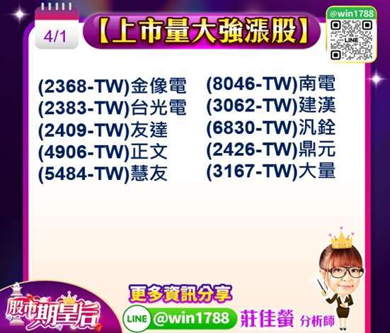 在美股強勢帶動下,市場情緒明顯翻多,台股今日跳空開高,早盤買氣迅速回溫,在 (2330-TW) 台積電,與 (5274-TW) 信驊,領軍下,加權指數盤中一度大漲逾千點,強勢收復 5.10.60 均線並重新站回 33000 點整數關卡,台股加權指數,台股今天開高走高,收盤漲 1451.83 點,為 33174.82 點,漲幅 4.58%,成交量來到 6161.23 億元;台股今日收量增紅 K 棒,直接收復重返季線大關! 昨日盤後影片公開預告,先下後上關鍵就是看融資,昨日上市櫃融資合計減肥 156.37 億元,自然今天就出現大反彈,台股本波回檔並未跌破 3/9 低點 31529.36 點,形成具支撐力 / 整理型態,歷史經驗顯示,地緣政治引發的急跌多為短期衝擊,容易形成波段低點,隨著 3 月震盪整理逐步完成,市場進入 4 月後,有望迎來反彈延續行情,基本面方面,AI 長線成長趨勢明確,美國雲端服務供應商持續擴大資本支出,高速運算需求強勁,帶動半導體產業景氣回升,台積電在先進製程與 AI 晶圓代工領域維持領先優勢,法人對 2026 年營運展望持正向看法,展望後市,台股上市櫃公司去年財報已全數出爐,在 AI 伺服器與高效能運算需求帶動下,第四季單季獲利衝上 1.29 兆元,全年獲利達 4.51 兆元,雙雙改寫歷史新高,基本面支撐明顯,台股多頭總司令張錫指出,台積電受惠 AI 需求爆發,明年 EPS 可望上看 120 元,以 25 倍本益比推算,股價挑戰 3000 元合理,台股指數有望站上 40000 點,隨 2 奈米量產推進及全球算力需求持續升溫,台灣供應鏈受惠明顯,AI 時代資金將集中於具競爭力的龍頭企業,矽光子與先進製程領域優勢明顯,後市偏多看待。