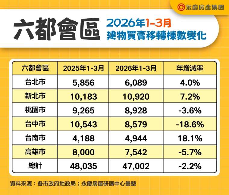 全台六都會區今 (1) 日公布 2026 年 3 月「建物買賣移轉棟數」,六都交易量合計為 1 萬 8283 棟,月增 74.4%,年微增 0.4%;2026 年第一 季交易量為 4 萬 7002 棟,較去年同期年減 2.2%。爲有紀錄來第三低紀錄,同時,房市不僅交易量走低,永慶房產調查顯示,首季六都房市交易價格也在緩跌。