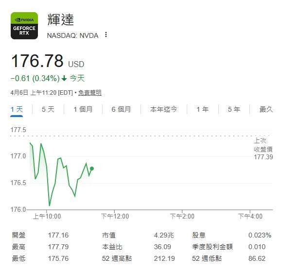 截稿前,輝達 (NVDA-US) 盤中股價小跌 0.34%,每股暫報 176.78 美元。