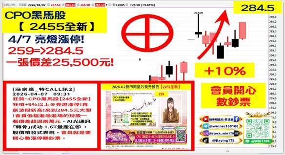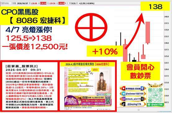 (8086-TW) 宏捷科,同步攻上漲停,3 月營收達 4.32 億元,月增 16%、年增 47%,創近 22 個月新高,首季營收年增達 58%,呈現淡季不淡格局,公司受惠中國 PA 市占率提升與非 PA 產品線放量,隨手機旺季來臨,法人預期第二季營收可望季增逾一成。其非 PA 布局涵蓋 800G、Wi-Fi 7、低軌衛星及 LiDAR 等領域,有助優化產品結構並提升毛利率。