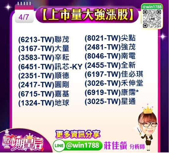 台股方面,受惠清明連假期間國際股市反彈激勵,加權指數今日展開補漲行情,開盤即跳空上揚,盤中最高大漲逾 690 點,高點來到 33,264 點,隨後漲幅略為收斂,終場上漲 657.39 點,收在 33229.82 點,成交量 5643.42 億,順利站回月線與 3.3 萬點整數關卡,市場信心明顯回溫,盤面結構由電子權值股領軍反攻,其中 (2330-TW) 台積電,收盤大漲 2.76%,成為推升指數的關鍵力量,(2303-TW)聯電,上漲 8.77%,(2308-TW)台達電,亦勁揚 5.94%,表現亮眼,顯示資金明顯集中於具題材性與高成長性的電子龍頭股,整體而言,台股在短線急彈後,技術面已明顯轉強,若國際股市維持穩定,不排除指數仍有續攻空間,考量地緣政治風險與聯準會政策不確定性仍在,預期盤勢將維持震盪偏多格局,操作上建議持續以選股為主,聚焦具產業趨勢與成長動能明確的族群。