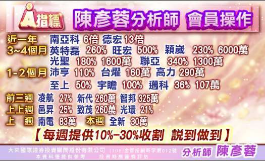 彥蓉真績效作節目,大盤拉回我們常逆勢獲利,大盤上漲帶會員經常超越大盤漲幅有預告證明,買起漲,不射飛鏢帶,買股,經常馬上發動,經常每週提供 10%-30% 以上收割。每檔一個月常有 30% 以上幅度,三個月左右翻倍。歡迎一起把握第二季三千點以上大行情。