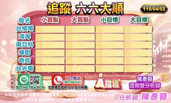 大來投顧陳彥蓉表示,美伊停火談判,美股支撐先行有守,科技股高成長回歸本益比均值,價值浮現有再大漲機會;台股上市櫃獲利再飆新高,3 月 PMI 持續擴張多頭強,戰事影響均值大回調,誘空盤勢內資猛撿遍地黃金,趕緊利用震盪站買方,飆股低點千載難逢,大量第 2 目標翻倍 LINE 留 777+1 索取。
