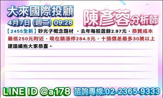 光通訊磊晶片,去年 EPS 2.97 元。想索取研究報告,LINE 留 2455+1。