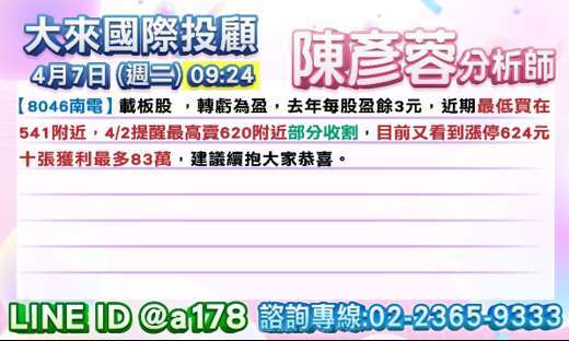 本欄最近一期 3/27 與 YT 頻道與 LINE 粉絲團,預告股票 南電 (8046-TW) 最近大盤大跌,南電最近一週大飆 10 張大賺百萬 恭喜!! 好友如想領先於當天早上九點前知道誰有機會當天連續長紅漲停? 1-2 個月後資金翻倍 100%? 歡迎點下面連接 加 LINE 留言 777+1 可領先得到提醒。