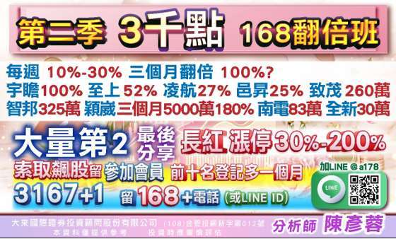 【3 千點 168 翻倍見證班】今天前十名登記 ,多一個月。 LINE 留 168 + 電話,資金 500 萬以上留 500 萬 + 電話。歡迎點下面 LINE 連結留言給彥蓉 ,我們一起打拼。