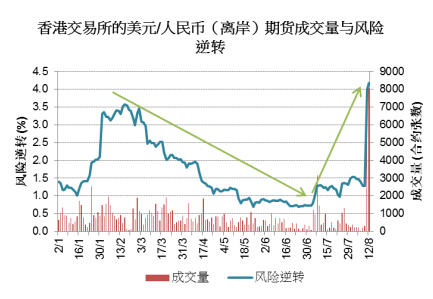 風險逆轉系數為場外交易(OTC)相關的認購和認沽期權之波幅差距,此數據可協助投資者作交易決定。8月11日中國人民銀行政策調整后,風險逆轉系數從1.2%急升至4.1%的歷史高位。由於風險逆轉系數仍顯著偏向美元兌人民幣認購期權,表示人民幣貶值壓力持續,市場對人民幣風險管理對沖需求將增大。