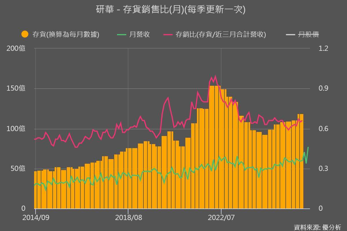 從研華(2395-TW) 的存貨與營收變化來看,存貨金額持續上升,但存銷比已從過去高檔明顯回落,代表庫存壓力已經消化,回到健康水位。