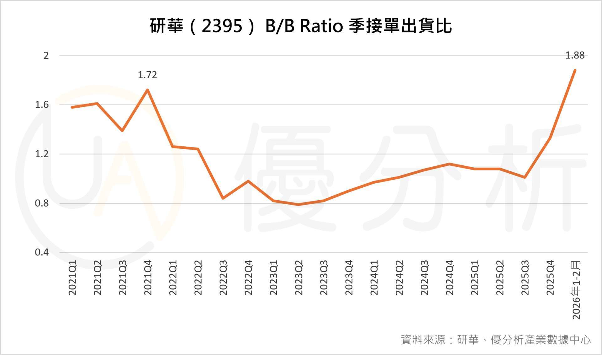 從數據來看,研華在 2025 年第 4 季 B/B 已回升至 1.33,而 2026 年 1–2 月更進一步拉高到 1.88。