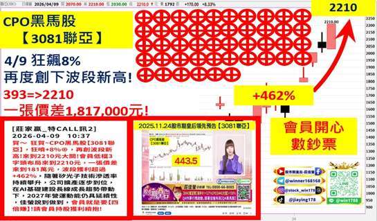 光通訊產業利多頻傳,輝達宣布向 Coherent 與 Lumentum 兩家光子技術公司合計投資 40 億美元,激勵兩家公司股價雙雙創新高,2026 年光纖通訊研討會暨展覽會分享光纖系統、網路及相關技術的最新研究與應用成果,(3081-TW) 聯亞,受惠矽光產品需求攀升,持續擴增資本支出以強化前段產能,董事會核准新增約 7 億元資本支出,主要用於前段 MOCVD 設備採購,目標提升前段產能約 25% 至 30%,並規劃自 2027 年起逐步貢獻產能,聯亞公布 3 月營收 3.43 億元,月增 18.26%、年增 89.35%,連續三個月創下歷史新高;第一季營收 9.04 億元,季增 40.78%、年增 98.98%,同步寫下新紀錄,市場認為,矽光產品在合併營收中占比已達 75% 至 80%,毛利率提升帶動獲利能力大幅改善。