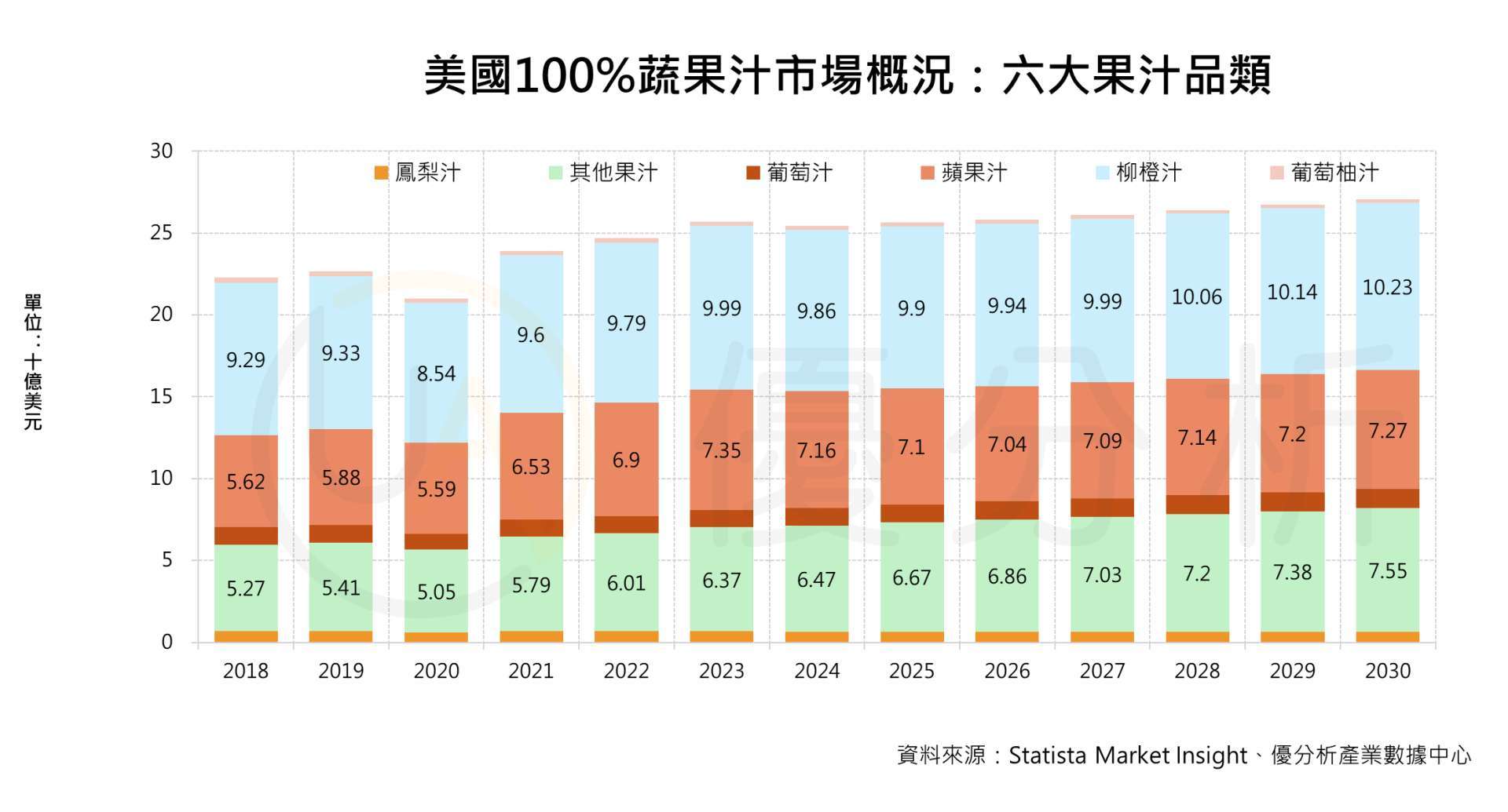 根據Statista Market Insight預估,美國果汁市場在2026年預計將達到256.8億美元的年營收,其中家庭消費(如超市和便利店)將貢獻131.2億美元,餐飲場所則達到125.5億美元。在家庭消費端,預計到2026年人均果汁消費收入將達37.6美元,總消費量達到51.7億公升。儘管市場年增長率較為溫和(2026-2030年CAGR為1.23%),但由於健康和機能性食品飲料逐漸受到消費者青睞,包含高纖、蛋白質等功能性成分的產品持續擴張。品牌如Suja Life專注於有機與健康果汁,正是順應此市場趨勢。