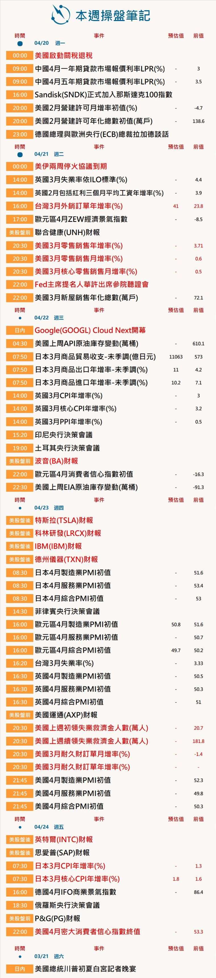 此外,英國、日本與紐西蘭等本週都將公布 3 月消費者物價指數 (CPI),這項通膨數據將成為評估油氣價格上漲如何傳導至整體物價的關鍵指標。