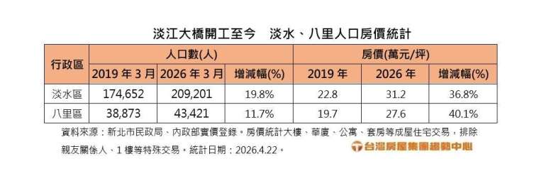 在房價表現方面,統計顯示,新北淡水區近 7 年來價漲 36.8%,八里區漲幅更達 40.1%,房價與人口數據都有慶祝行情。