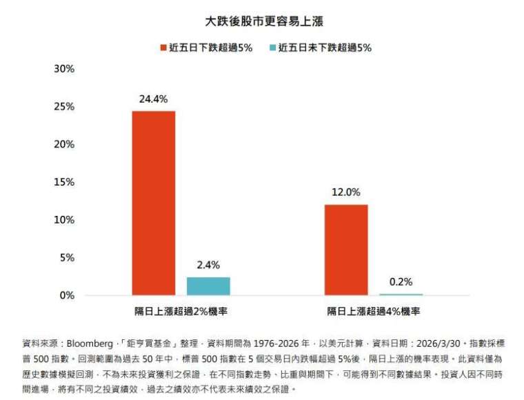 股市漲漲跌跌,有時讓人心驚膽跳。尤其是當全球市場受到諸多不確定性影響、波動加劇時自己投資時就更容易因為短期震盪而慌張賣出,結果錯過後續反彈的好機會。我們回測標普 500 指數過去 50 年的資料發現,只要連續五個交易日累積下跌超過 5%,隔天上漲超過 2% 的機率竟然高達 24.4%,隔天上漲超過 4% 的機率也有 12%,遠高於那些「近五日沒有大跌」時的表現。這顯示,每次大跌其實不是賣出的信號。