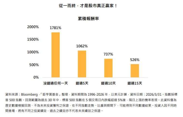 很多人投資股票時喜歡頻繁進出,但你知道嗎?其實堅持長期持有、「從一而終」的策略,反而更有機會創造更好的報酬!根據統計,標普 500 指數在過去 30 年累積總報酬高達 1,781%,但只要錯過漲幅最大的 5 天,總報酬率就會大幅減少 719 個百分點;錯過前 10 個最大漲幅日,報酬率更會少掉 1,044 個百分點;若錯過前 15 個最大漲幅日,報酬將蒸發高達 1,255 個百分點!差距驚人,不容小覷。與其頻繁進出、錯失市場最關鍵的黃金時刻,不如穩穩待在市場裡,才能真正掌握長期成長的力量。