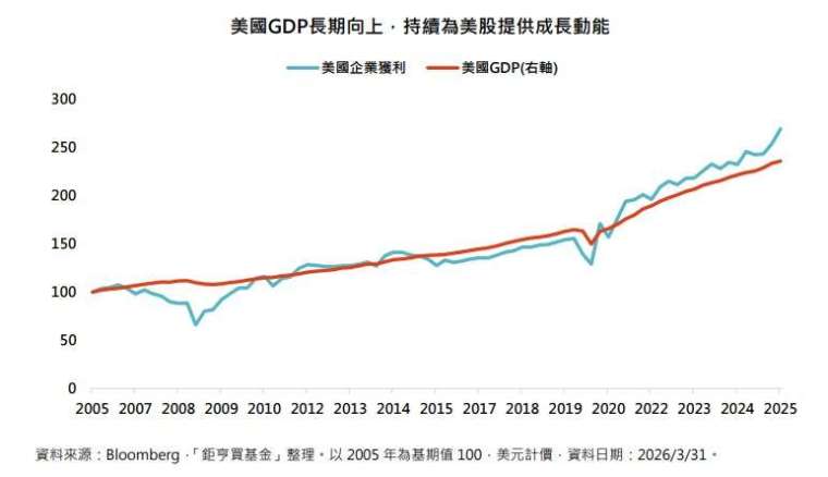 最近,雖然美股因關稅政策的不確定性出現明顯震盪,但從長期來看,美國股市的走勢仍緊貼經濟基本面。自 2005 年至 2025 年,美國名目 GDP 與企業獲利分別成長了 159% 與 124%,展現股市表現與實體經濟活動的高度連動。展望未來,隨著 AI技術的廣泛應用,企業營運效率與生產力可望大幅提升,進一步支撐經濟成長。儘管短期內市場可能因政策變動而波動,但從長遠來看,股市終將反映經濟的真實狀況。