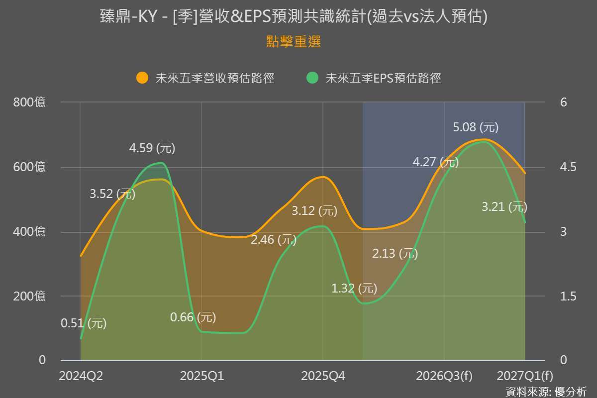 值得注意的是,法人原先預估臻鼎KY 2026年第一季每股盈餘約1.32元,但公司光是3月單月每股盈餘就達1.27元,幾乎追平整季預估,顯示獲利水平仍可能有上修空間。