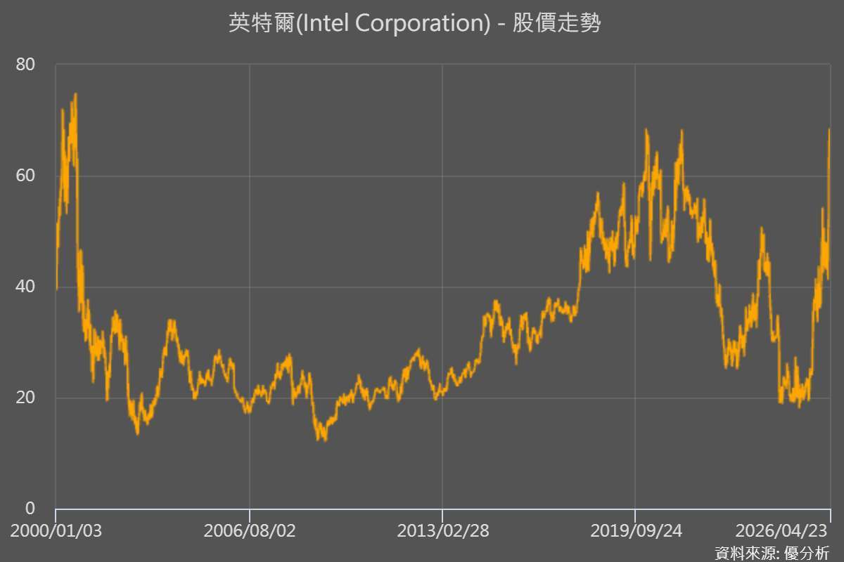 2026年04月24日(優分析/產業數據中心報導)⸺ 英特爾Intel(INTC-US)第一季受惠AI服務業者對中央處理器(CPU)需求強勁,甚至連原本已列為滯銷或舊規格的晶片庫存也被客戶買走,帶動股價週五盤前大漲28%,最新報價86美元,若開盤維持漲勢,將改寫2000年網路泡沫時期高點。