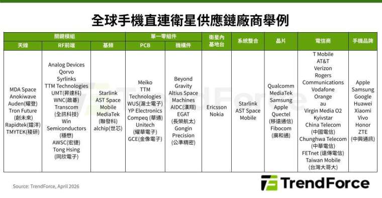 分析全球手機直連衛星供應鏈,上游聚焦關鍵模組,涵蓋天線、射頻前端與基頻晶片。例如 Anokiwave 提供衛星晶片,Analog Devices、Qorvo 供應射頻模組;而 Starlink、AST SpaceMobile 則自行開發基頻模組,以克服太空通訊的高延遲問題。供應鏈中游為衛星內基地台與系統整合,通常由零組件廠提供模組後,交由 Starlink、AST SpaceMobile 進行整體的衛星系統整合。下游為手機與電信服務端,由 Samsung、Google、Vivo 等品牌導入 Qualcomm 或 MediaTek 的衛星通訊晶片,並由電信商推出對應的手機直連衛星服務方案。