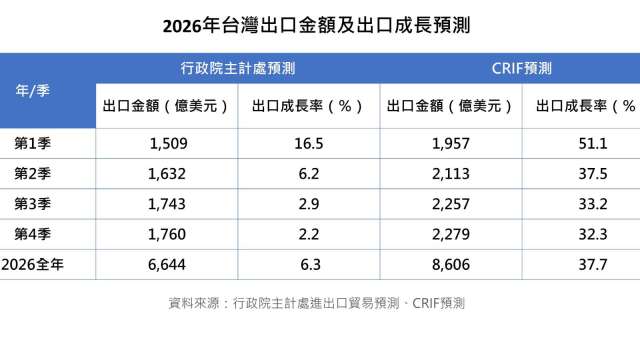 若無重大變數,CRIF 樂觀預測 2026 年的第二季至第四季出口金額分別為 2113 億美元、2257 億美元、2279 億美元,全年總額上看 8606 億美元,年增率達 37.7%。不過,第二季出口是否能站穩 2000 億美元大關,將是判斷全年成長幅度的關鍵指標。