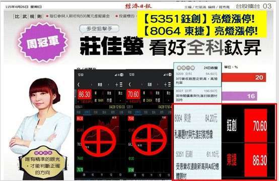 今日盤面上的重點股集中在經濟日報冠軍股上面,六檔持股二檔股票雙雙噴出,(5351-TW) 鈺創,(8064-TW) 東捷,亮燈漲停!