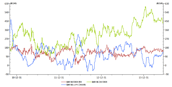從上圖可以看出,石腦油-原油的裂解價差目前在160 美元/噸附近盤整;乙烯-石腦油裂解價差在460美元/噸附近盤整,在去年底達到高點后回落,但仍處於相對高位;lldpe-乙烯裂解價差在3月一度達到低點,甚至出現負值后,隨著石化挺價規則的推出,3月份lldpe市場價格的走高,裂解價差也迅速回升,目前在100美元/噸附近盤整。目前 lldpe產業鏈裂解價差窄幅盤整,基本穩定,不會對廠家增產或減產形成強刺激。