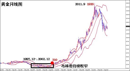 黃金月線圖所示:黃金在1997年12月至2002年12月這5年時間內,一直保持低位持續窄幅震盪行情,且期間通到對布林頻道的指標認定上,布林帶處於持續收窄的現象。5年的時間積蓄,一旦行情突破了布林頻道的震盪帶(布林頻道上軌或下軌區間),不論行情往哪一個方向進行突破,均會帶來單邊大行情,我們投資者所要做的就是耐心等待,價格對震盪帶的突破,不要提前與預測,只要跟隨者突破后確立的趨勢方向進行操作就可以了,非常簡單的方法。讀者如有不明白的地方,可直接登入英倫金業官網向1對1分析師提問。