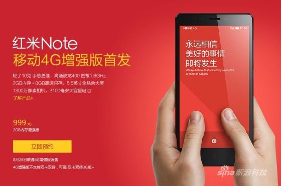新浪手機訊 8月5日午間消息,小米科技今日通過其微博及官網正式發布紅米Note 4G版手機,相對之前紅米Note,它最大改進是加入了4G網絡支持。