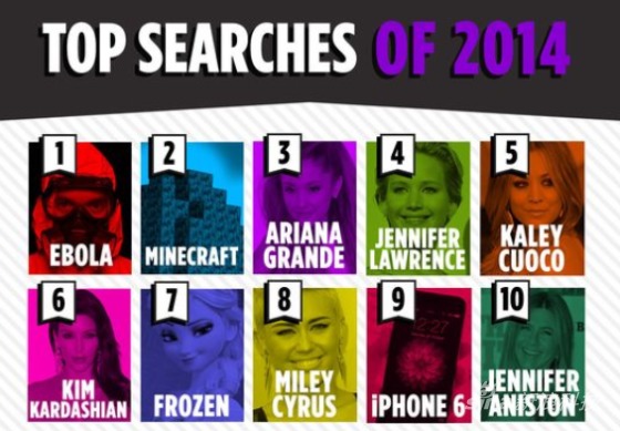排在榜首的自然是埃博拉,各種傳言與恐懼已經遠遠大於疾病本身,也是網友搜索的焦點。Minecraft《我的世界》游戲位居第二,艷照門主角詹妮弗·勞倫斯(Jennifer Lawrence)第四。從不缺少話題的社交名媛金·卡戴珊(Kim Kardashian)憑藉臀部放置酒杯接香檳再次走紅社交網絡,位列第六。《冰雪奇緣》電影排名第七,娛樂圈常青樹、《老友記》演員詹妮弗·安妮斯頓(Jennifer Aniston)在iPhone 6之后,排第十。