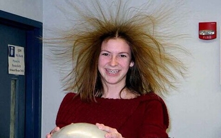 我們可以站在緣的椅子上,用手按范德格拉夫起電機的球形金屬罩(這個東西很多科技館都有,很多大學物理系也有)。由於人的身體也可導電,所以當起電機啟動時,電荷便傳到我們的身體上。而因為頭髮上的電荷互相排斥,頭髮便豎立起來。
