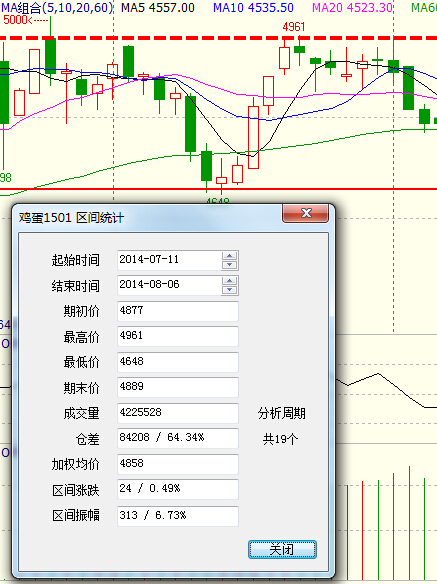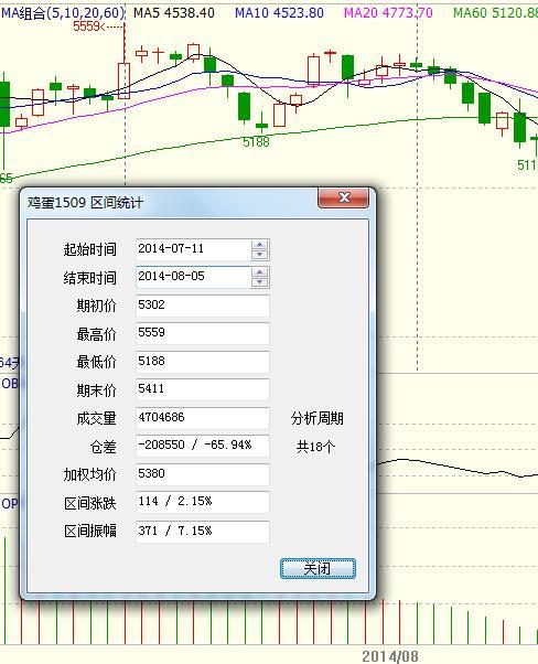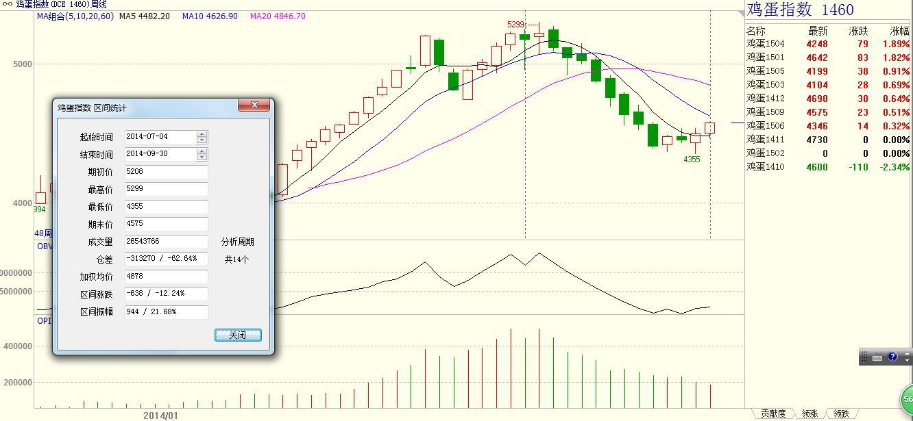 雞蛋主力合約4月中旬由1405合約轉化成為jd1409合約之后,jd1409成為火箭蛋行情的完美載體,上市之初受到jd1405合約的聯動影響,經歷一小段跌幅之后,市場開始炒作對后期蛋雞存欄偏少的預期,2014年1月16日開始,行情開始反轉,自最低點4143元/500千克開始反彈,從此09合約體現出易漲難跌的走勢。這市場的一切行為,都是基於對禽流感嚴重影響存欄,9月雞蛋供應有限,需求放大這一預期無限放大,導致期現價格雙雙提前達到高點,在5月中旬均創下歷史新高,期貨最高價達5282元/500千克。現貨價格破五之后,雞蛋銷量下降,受到囤貨、霉蛋的影響,現貨價格深幅回調,帶動期貨價格下跌,一度跌至4857元/500千克。之后隨著雞蛋價格的企穩回升,期貨09合約受到帶動,再次一路上行,直到7月2日,受技術面超漲以及大商所協查傳言的影響,期價大幅下挫至5065元/500千克,但一時間買盤進入,期價收盤至5210元/500千克。隨后09合約繼續受到多頭資金推動,增倉上行,期價一度被拉升至5559元/500千克,體現出多頭的決心。