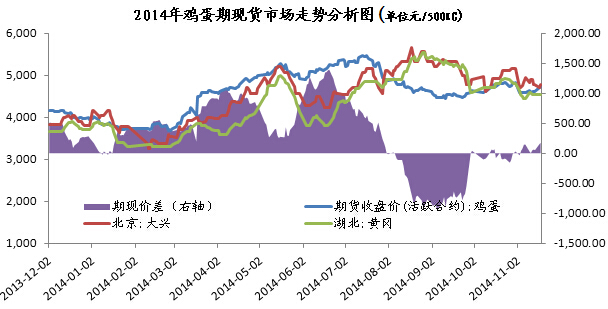 2014年期現運行行情與雞蛋市場基本面基本吻合,現貨市場上半年受禽流感影響,蛋價波動較大;上游成本影響逐漸鈍化,雞蛋期市寬幅震盪,作為金融特性,資金參與活躍,導致短期內期價與基本面背離發生頻率較高,期貨市場定價功能初現;