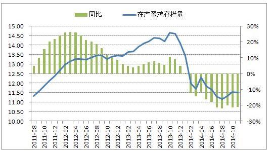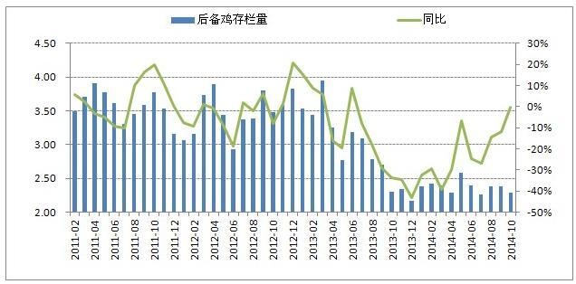 具體數據方面,2014年10月全月后備雞(還未下蛋的蛋雞,包括育雛雞和青年雞)存欄量較2014年9月減少3.84%,同比減少0.51%。但對比圖表可以發現,后備雞同比下降幅度出現逆增長,這印證了國內蛋雞存欄持續恢復的情況。