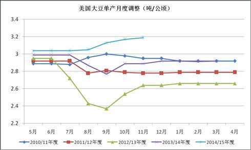 同時,美國農業部(usda)在12月的報告顯示,美國2014/15年度大豆種植面積預估為8420萬英畝,大豆收割面積預估為8340萬英畝,大豆單產預估為每英畝47.5蒲式耳,大豆產量預估為39.58億蒲式耳,大豆壓榨預估為17.8億蒲式耳,這些和11月預估沒有變化。大豆出口量上調4000萬蒲式耳至17.6億蒲式耳,反映了近幾周創歷史紀錄的出口銷售步伐和南美收割前額外的出口銷售及裝船情況。大豆壓榨量持平,預計14/15年大豆期末庫存4.1億蒲式耳,較上月下調4000萬蒲式耳,但仍然創自2006/07年以來歷史紀錄。