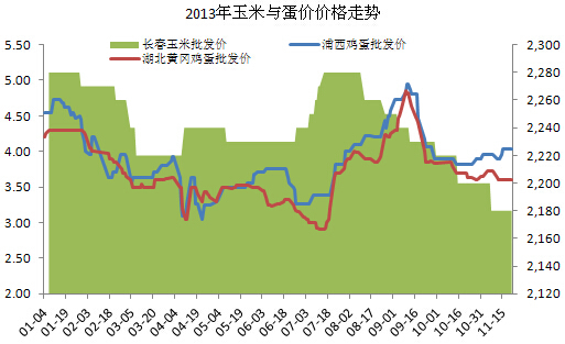 據筆者長期觀察,玉米與蛋價存在較大的相關度。一般情況下,玉米價格上升,蛋價會穩步上升,但是當雞蛋供應偏緊之時,玉米走勢就會與蛋價發生背離現象;下圖以2013年玉米與雞蛋價格走勢圖加以說明