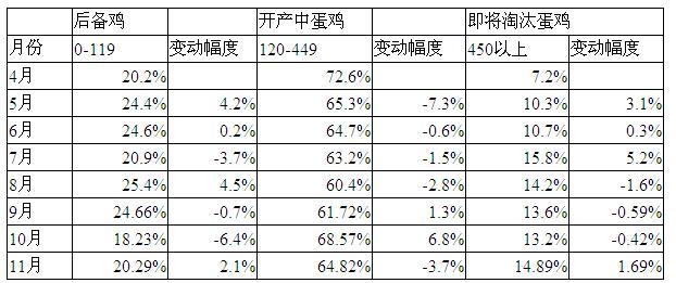 根據歷史雞齡結構與8-9月雞齡結構的對比可以印證,8-9月后備雞雞齡占比有所增加,這說明養殖戶補欄積極性提高。11月,后備雞存欄恢復增長,蛋雞供應繼續增加。