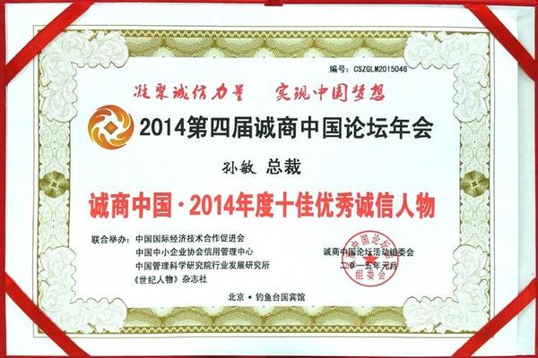 銀谷公司總裁孫敏榮膺“2014年度十佳優秀誠信人物”