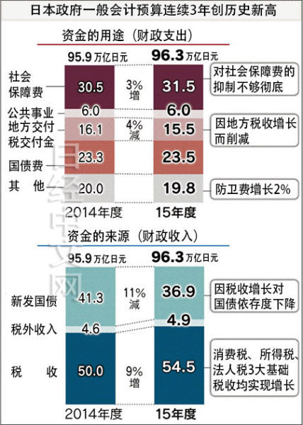 日本政府在1月14日的內閣會議上敲定了2015年度預算案。顯示政府預算基本規模的一般會計總額達到96萬3420億日元,創歷史新高。